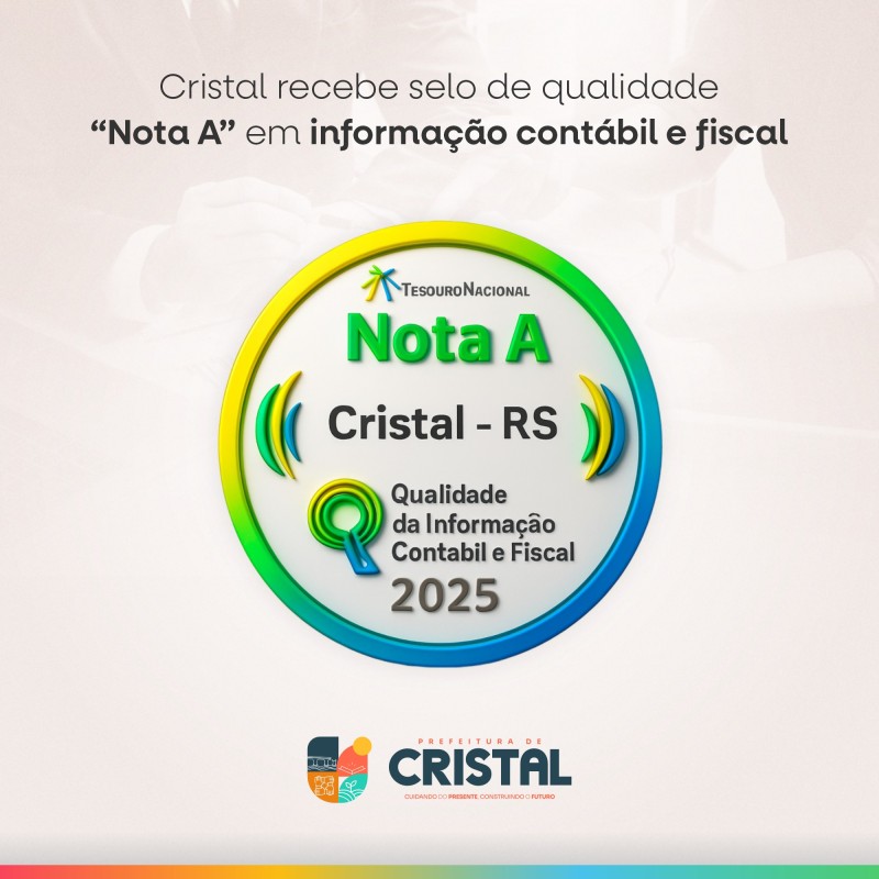 O município de Cristal recebeu em 2025 o Selo de Qualidade da Informação Contábil e Fiscal “Nota A”, concedido pelo Siconfi (Sistema de Informações Contábeis e Fiscais do Setor Público Brasileiro), ligado à Secretaria do Tesouro Nacional.
