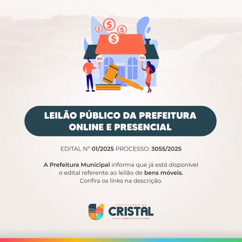 A Prefeitura Municipal de Cristal, por meio da Secretaria da Fazenda, realiza no dia 7 de outubro de 2025, às 10h, o Leilão Público nº 01/2025, com participação presencial e online.