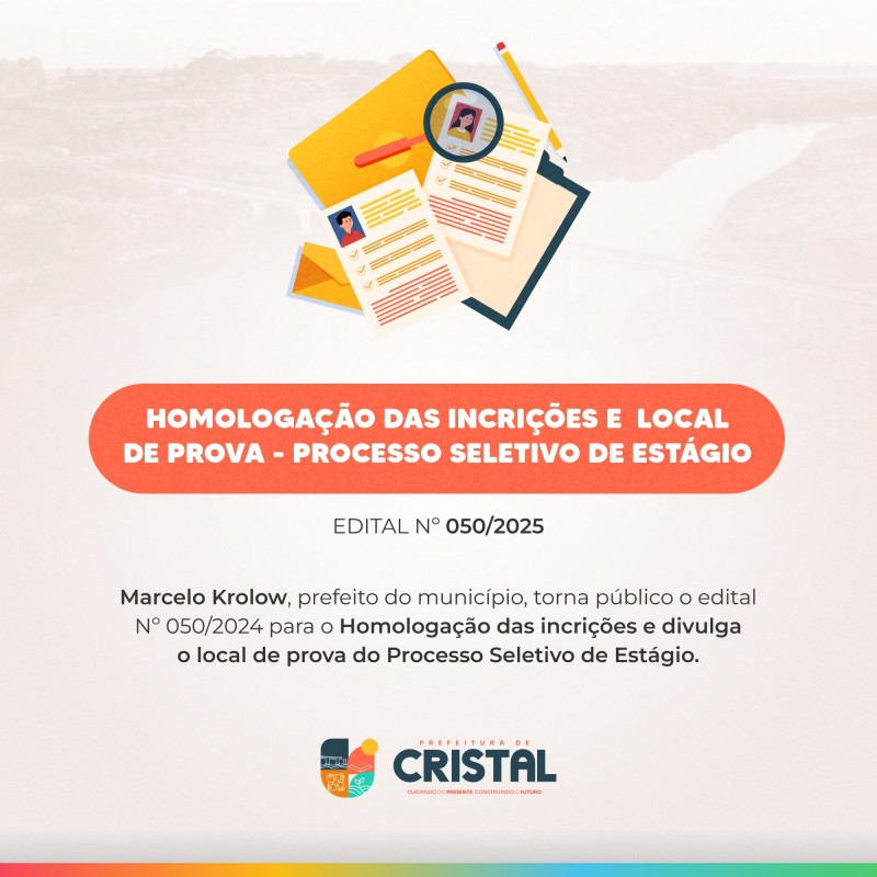 A Prefeitura Municipal de Cristal publicou nesta quinta-feira o Edital nº 050/2025, que homologa as inscrições do Processo Seletivo Simplificado para cadastro reserva de estagiários e divulga o local da aplicação da prova teórica.